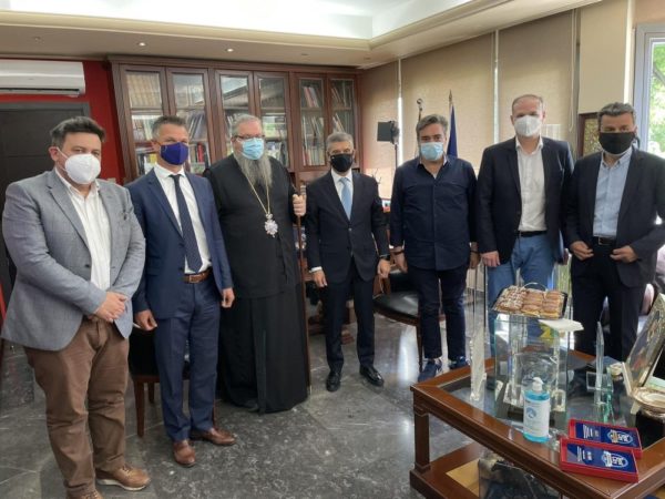 Στην Περιφέρεια Θεσσαλίας μετέβη ο Σεβασμιώτατος Μητροπολίτης Λαρίσης και Τυρνάβου κ. Ιερώνυμος, συνοδευόμενος από τον Πρωτοσύγκελλο της Ιεράς Μητροπόλεως π. Ιγνάτιο, και ευχήθηκε στον εορτάζοντα Περιφερειάρχη Θεσσαλίας κ. Κωνσταντίνο Αγοραστό να τον στερεώνει ο Αναστάς Κύριος και να έχει την ευλογία των Αγίων Κωνσταντίνου και Ελένης στη ζωή του.
