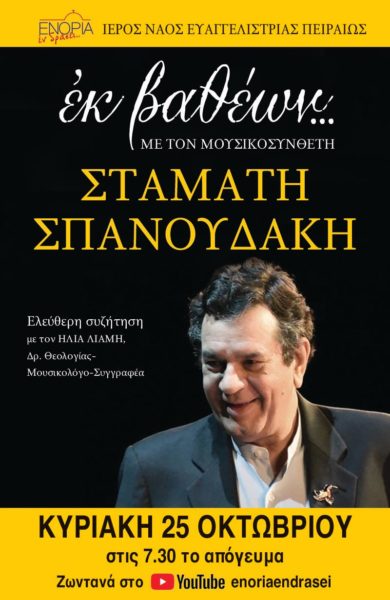 Την Κυριακή 25 Οκτωβρίου στις 7.30 το απόγευμα θα λάβει χώρα ελεύθερη συζήτηση με τον Ηλία Λιαμή Δρ. Θεολογίας και τον γνωστό μουσικοσυνθέτη Σταμάτη Σπανουδάκη, την οποία μπορείτε παρακολουθήσετε ΖΩΝΤΑΝΑ στο ΕΝΟΡΙΑ ΕΝ ΔΡΑΣΕΙ.