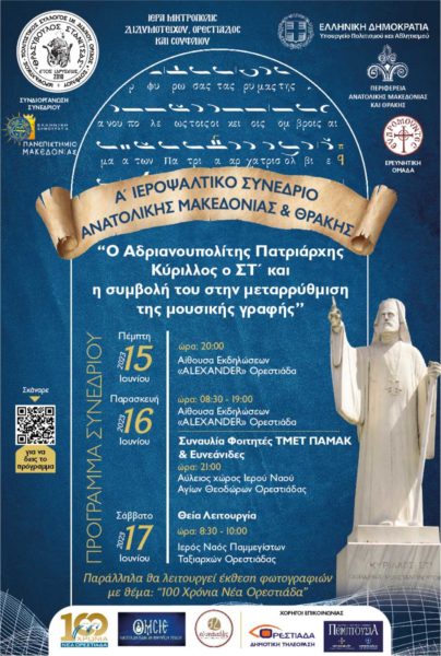 Ο τίτλος του Συνεδρίου, που συνέπεσε με τους εορτασμούς και τις εκδηλώσεις για τα 100 χρόνια ίδρυσης της Νέας Ορεστιάδας, ήταν: «Ο Αδριανουπολίτης Πατριάρχης Κύριλλος ο ΣΤ΄ και η συμβολή του στην μεταρρύθμιση της μουσικής γραφής», ενώ η θεματική κινήθηκε σε παιδαγωγικά ζητήματα της Ψαλτικής Τέχνης. Ως εκπρόσωπος της Α.Θ.Π. του Οικουμενικού Πατριάρχη κ.κ. Βαρθολομαίου παρέστη ο πανοσ. Αρχιμ. Λάζαρος Θεοδοσίου.