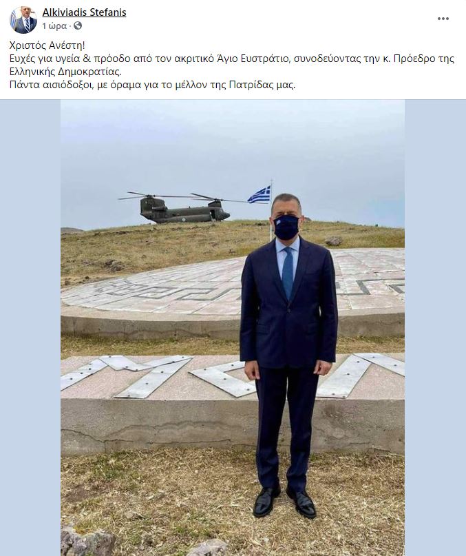 “Χριστός Ανέστη! Ευχές για υγεία & πρόοδο από τον ακριτικό Άγιο Ευστράτιο, συνοδεύοντας την κ. Πρόεδρο της Ελληνικής Δημοκρατίας. Πάντα αισιόδοξοι, με όραμα για το μέλλον της Πατρίδας μας.”, αναφέρει το ευχετήριο μήνυμα του Υφυπουργού Εθνικής Άμυνας σε μέσο κοινωνικής δικτύωσης.