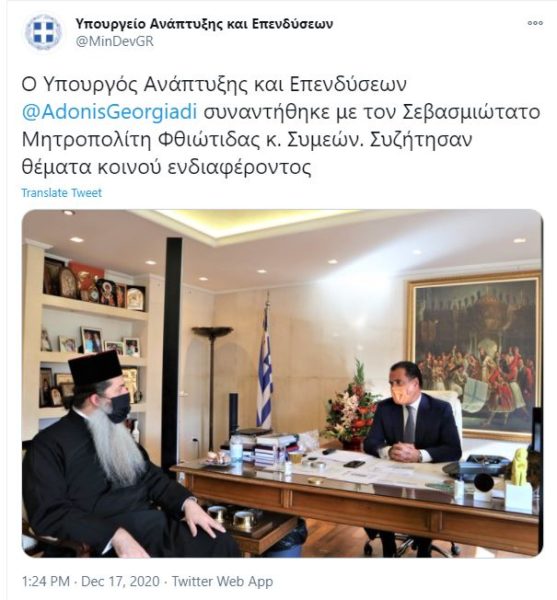 17/12/2020 17/12/2020 Ο υπουργός Ανάπτυξης και Επενδύσεων κ. Άδωνης Γεωργιάδης συναντήθηκε με τον Σεβασμιώτατο Μητροπολίτη Αδριανουπόλεως κ. Αμφιλόχιο, ο οποίος είναι εκπρόσωπος του γραφείου του Οικουμενικού Πατριαρχείου στην Αθήνα και συζήτησαν θέματα κοινού ενδιαφέροντος.  Ακόμα συναντήθηκε με τον Σεβασμιώτατο Μητροπολίτη Φθιώτιδος κ. Συμεών. Τις συναντήσεις έκανε γνωστές μέσω ανάρτησης στο twitter ο επίσημος λογαριασμό του Υπουργείου Ανάπτυξης...