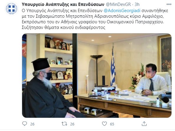 Ο υπουργός Ανάπτυξης και Επενδύσεων κ. Άδωνης Γεωργιάδης συναντήθηκε με τον Σεβασμιώτατο Μητροπολίτη Αδριανουπόλεως κ. Αμφιλόχιο, ο οποίος είναι εκπρόσωπος του γραφείου του Οικουμενικού Πατριαρχείου στην Αθήνα και συζήτησαν θέματα κοινού ενδιαφέροντος.  Ακόμα συναντήθηκε με τον Σεβασμιώτατο Μητροπολίτη Φθιώτιδος κ. Συμεών. Τις συναντήσεις έκανε γνωστές μέσω ανάρτησης στο twitter ο επίσημος λογαριασμό του Υπουργείου Ανάπτυξης και Επενδύσεων.