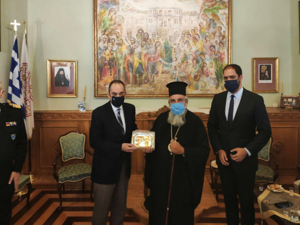 Σε ανάμνηση της επισκέψεως ο Σεβασμιώτατος και ο Υπουργός Ναυτιλίας αντάλλαξαν αναμνηστικά δώρα.