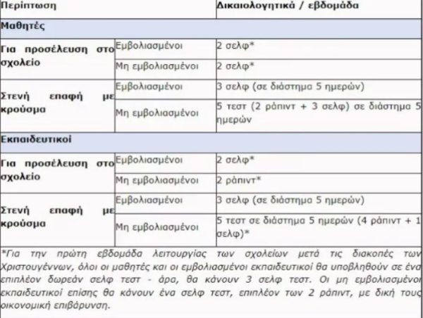 Πλέον όλοι οι μη εμβολιασμένοι μαθητές θα κάνουν δωρεάν τεστ, κάθε μέρα, για 5 ημέρες. Συγκεκριμένα, θα κάνουν δύο ράπιντ και ένα σελφ τεστ σε διάστημα 5 ημερών, επιπλέον των δύο σταθερών σελφ τεστ την εβδομάδα, άρα 5 τεστ σε 5 ημέρες. Οι εμβολιασμένοι μαθητές θα κάνουν ένα σελφ τεστ, επιπλέον των δύο εβδομαδιαίων σελφ τεστ, δηλαδή συνολικά τρία σελφ τεστ δωρεάν την εβδομάδα.