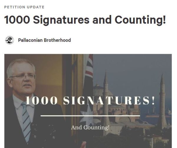Υπόμνημα/Αίτημα που καλεί τον πρωθυπουργό της Αυστραλίας Σκόττ Μόρισον να στείλει ηχηρό μήνυμα προς την τουρκική κυβέρνηση, απαιτώντας την ανάκληση της απόφασης μετατροπής της Αγίας Σοφίας σε τζαμί, υπάρχει αυτές τις μέρες στο διαδίκτυο από την ιστοσελίδα change.org.