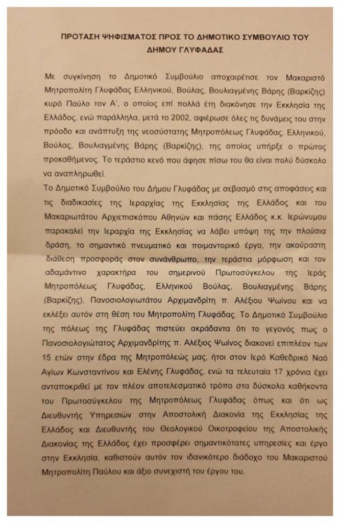 Το Δημοτικό Συμβούλιο Γλυφάδας με σεβασμό στις αποφάσεις και στις διαδικασίες της Ιεραρχίας της Εκκλησίας της Ελλάδος και του Μακαριωτάτου Αρχιεπισκόπου Αθηνών και πάσης Ελλάδος κ.κ. Ιερώνυμου παρακαλεί την Ιεραρχία της Εκκλησίας να λάβει υπόψη της, την πλούσια δράση, το σημαντικό πνευματικό και ποιμαντορικό έργο, την ακούραστη διάθεση προσφοράς στον συνάνθρωπο, την τεράστια μόρφωση και τον αδαμάντινο χαρακτήρα του σημερινού Πρωτοσύγκελου της Ιεράς Μητρόπολης Γλυφάδας, Ελληνικού, Βούλας, Βουλιαγμένης, Βάρης (Βαρκίζης), Πανοσιολογιωτάτου Αρχιμανδρίτη π.Αλέξιου Ψωίνου και να εκλέξει αυτόν στη θέση του Μητροπολίτη.