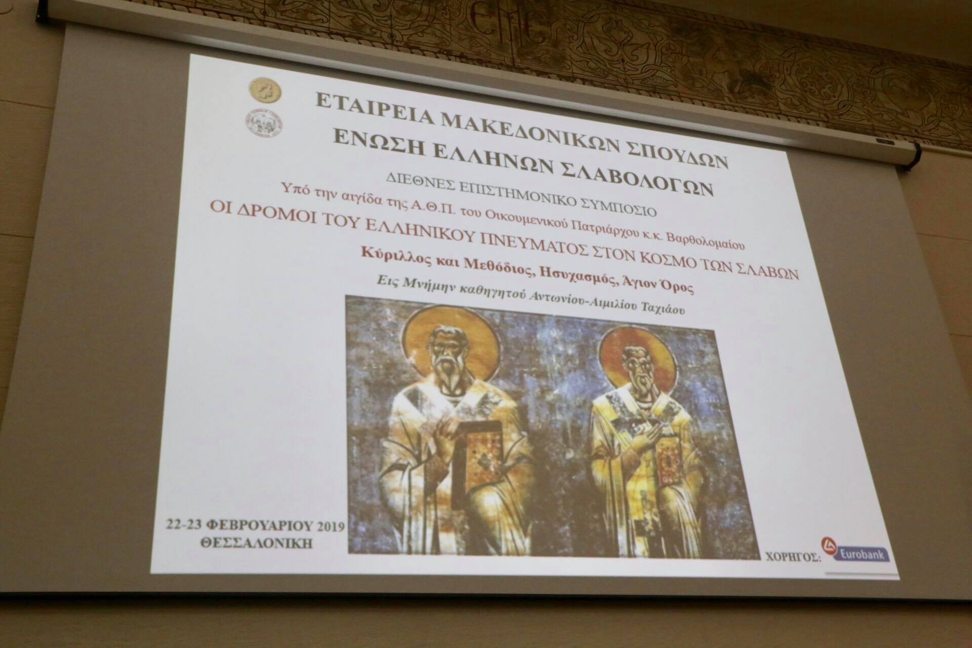 Η Εταιρεία Μακεδονικών Σπουδών και η Ένωση Ελλήνων Σλαβολόγων κήρυξαν σήμερα στην αίθουσα διαλέξεων της Εταιρείας, την έναρξη των εργασιών του Διεθνούς Επιστημονικό Συμποσίου με θέμα ” Οι δρόμοι του Ελληνικού Πνεύματος στον κόσμο των Σλάβων”.- Κύριλλος και Μεθόδιος, Ησυχασμός, Άγιον Όρος. Εις μνήμην του καθηγητού Αντωνίου-Αιμίλιου Ταχιάου. Το Συνέδριο λαμβάνει χώρα στο πλαίσιο των εορταστικών Εκδηλώσεων για τα 80 χρόνια της Εταιρείας Μακεδονικών Σπουδών. Συμμετέχουν έγκριτοι ακαδημαϊκοί και σλαβολόγοι από την Ελλάδα και το εξωτερικό, γεγονός που εγγυάται την επιτυχία του Συμποσίου και το υψηλού επίπεδο εισηγήσεις που θα ακουστούν.