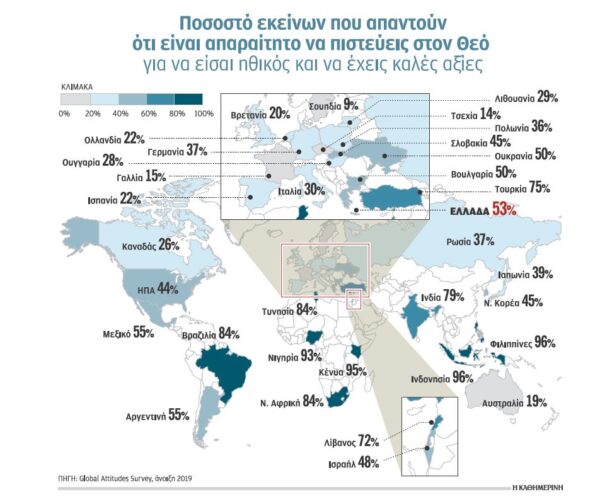 Tην πρώτη θέση σε ό,τι αφορά την πεποίθηση ότι η πίστη στον Θεό ταυτίζεται με την ηθική και πρώτοι στον δυτικό κόσμο, πάνω ακόμα και από τις ΗΠΑ, σε ό,τι αφορά τη σημασία που έχει η θρησκεία στη ζωή μας είναι οι Έλληνες, όπως δείχνουν τα στοιχεία παγκόσμιας έρευνας που διενήργησε το αμερικανικό Pew Research Center σε 34 χώρες από τις 13 Μαΐου ώς τις 2 Οκτωβρίου 2019 με τη συμμετοχή 38.426 πολιτών.