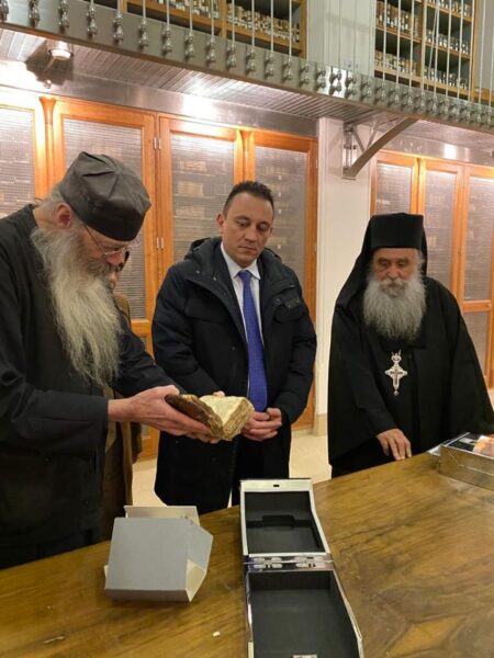 Ο κ. Βλάσης είχε τη δυνατότητα να θαυμάσει από κοντά τα ιερά κειμήλια που φυλάσσονται εκεί, καθώς επίσης και να διαπιστώσει το υψηλό έργο που επιτελούν οι Έλληνες μοναχοί.