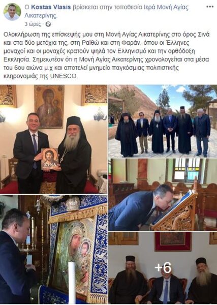 “Ολοκλήρωση της επίσκεψής μου στη Μονή Αγίας Αικατερίνης στο όρος Σινά και στα δύο μετόχια της, στη Ραϊθώ και στη Φαράν, όπου οι Έλληνες μοναχοί και οι μοναχές κρατούν ψηλά τον Ελληνισμό και την ορθόδοξη Εκκλησία. Σημειωτέον ότι η Μονή Αγίας Αικατερίνης χρονολογείται στα μέσα του 6ου αιώνα μ.χ και αποτελεί μνημείο παγκόσμιας πολιτιστικής κληρονομιάς της UNESCO, αναφέρει, σε ανάρτησή του.