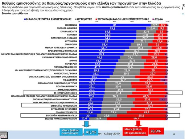 Σε έρευνα που διενεργήθηκε τον περασμένο Μάιο από την MRB ενόψει των ευρωεκλογών για λογαριασμό του ιδρύματος Konrad Adenauer, η οικογένεια και οι ένοπλες δυνάμεις της χώρας αποτελούν τους θεσμούς τους οποίους εμπιστεύονται περισσότερο οι Έλληνες πολίτες. Σύμφωνα με την εν λόγω έρευνα ο θεσμός της «οικογένειας» είναι αυτός που εμπιστεύονται περισσότερο από όλους με ποσοστό 81% και ακολουθούν οι ένοπλες δυνάμεις με 75,8%, ενώ η Εκκλησία βρίσκεται στην τέταρτη θέση με ποσοστό 64, 8%.