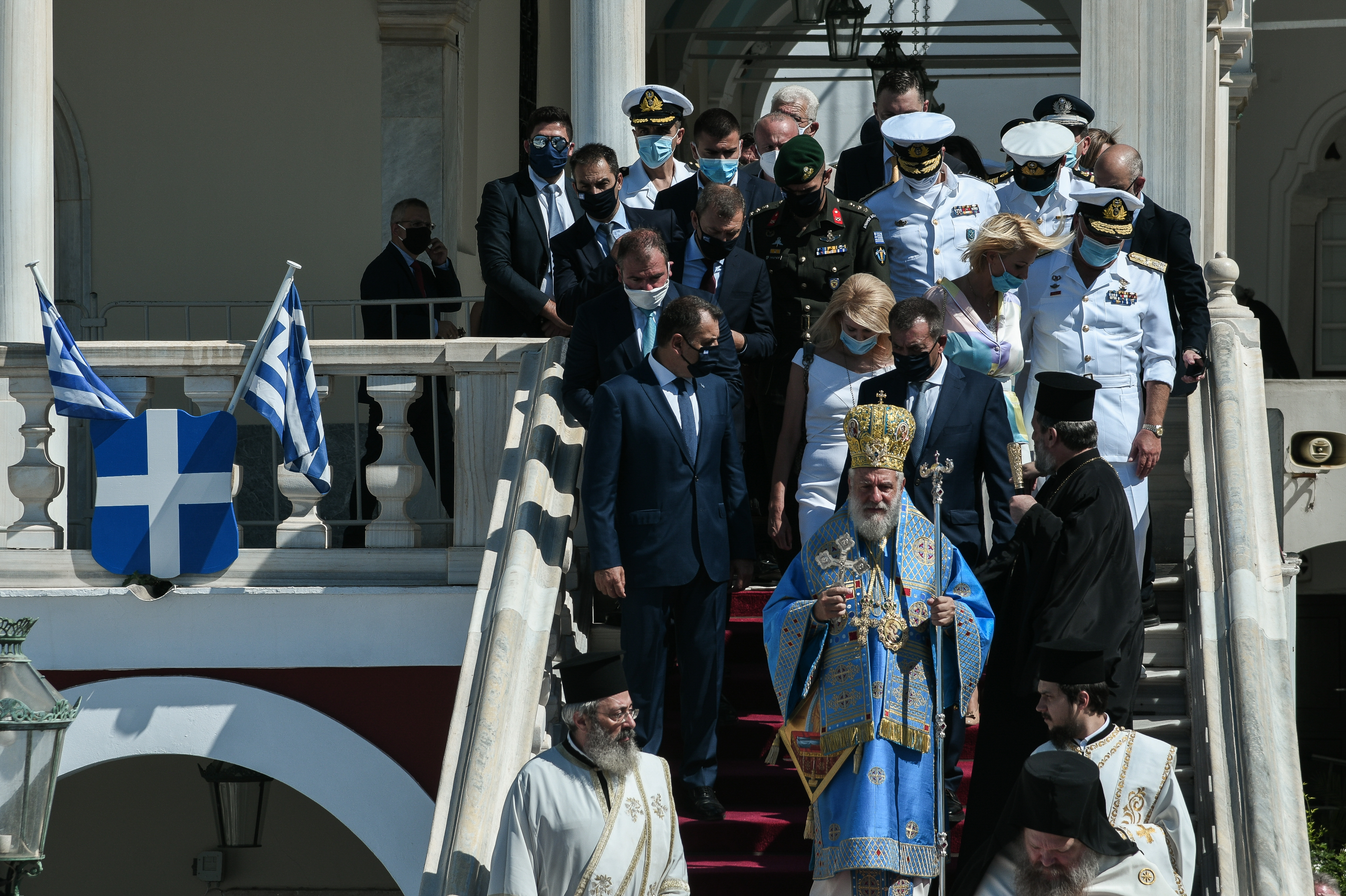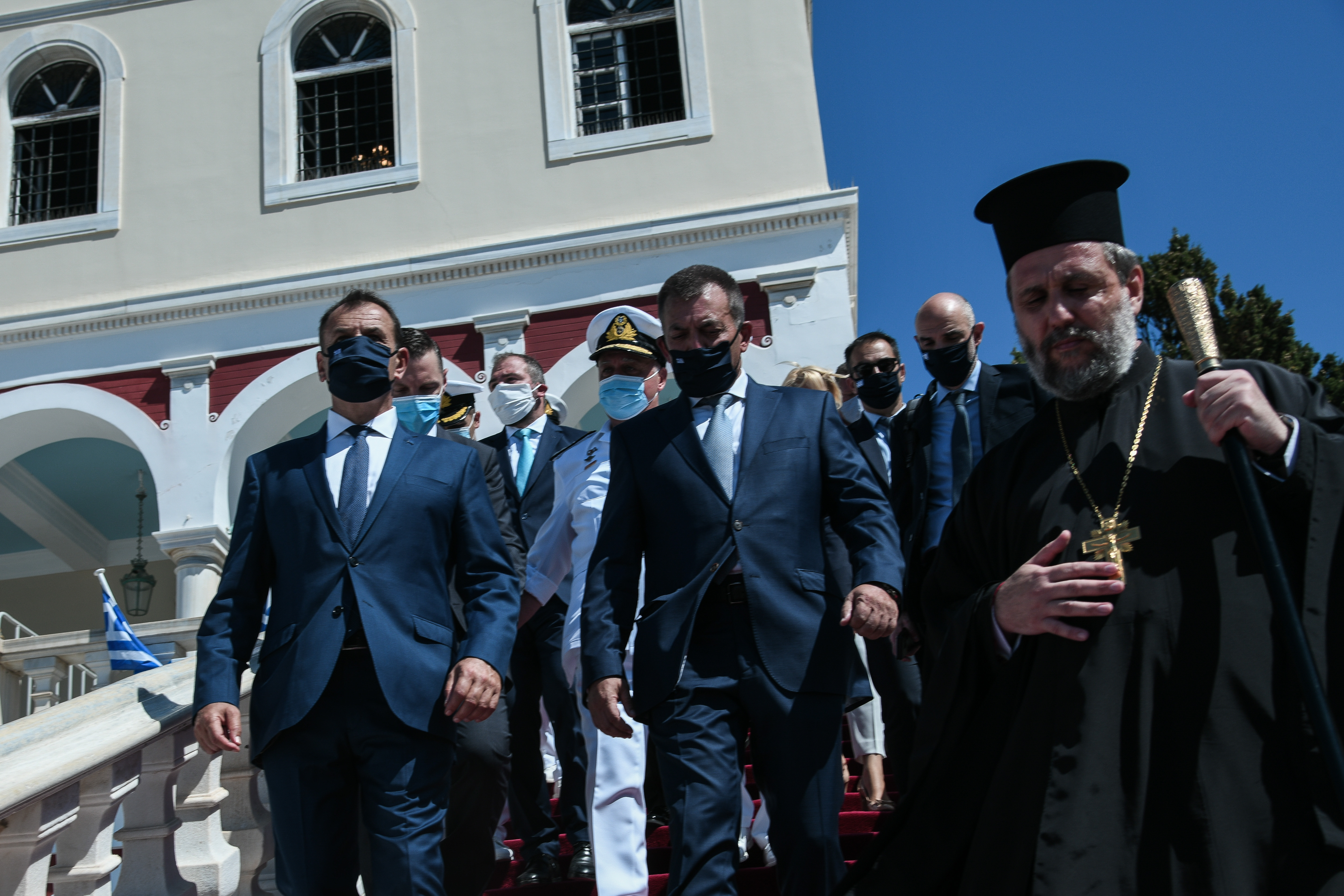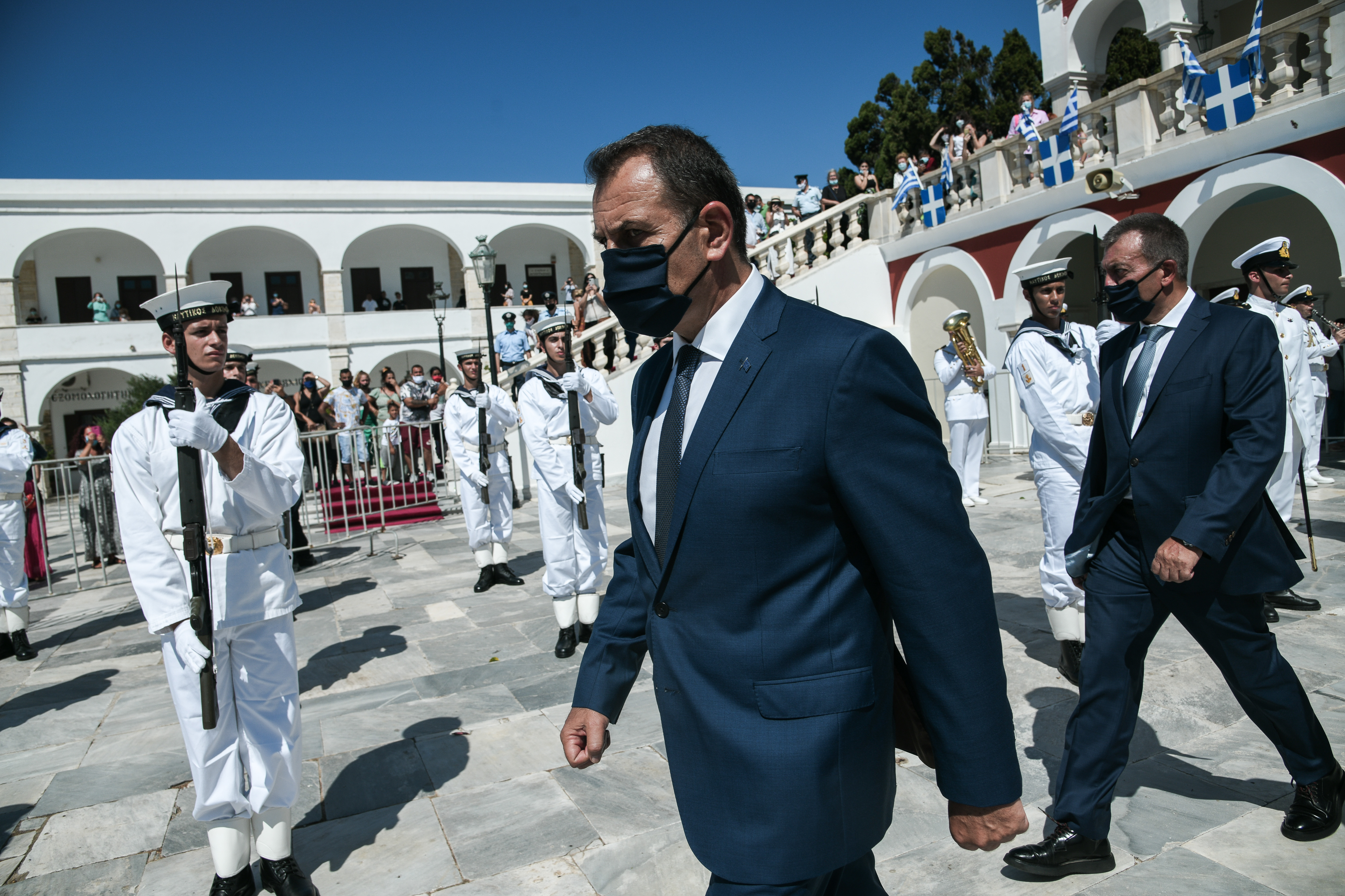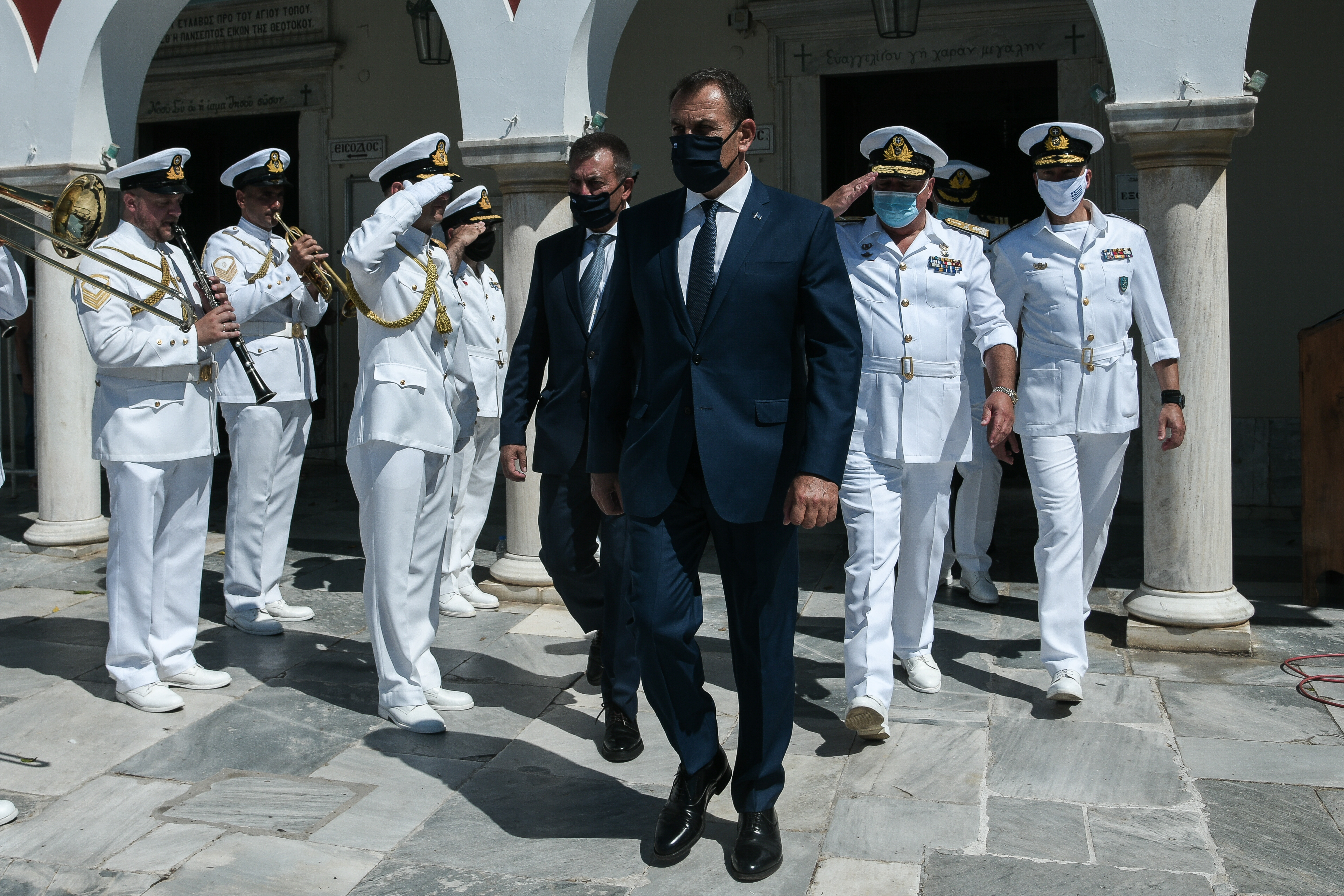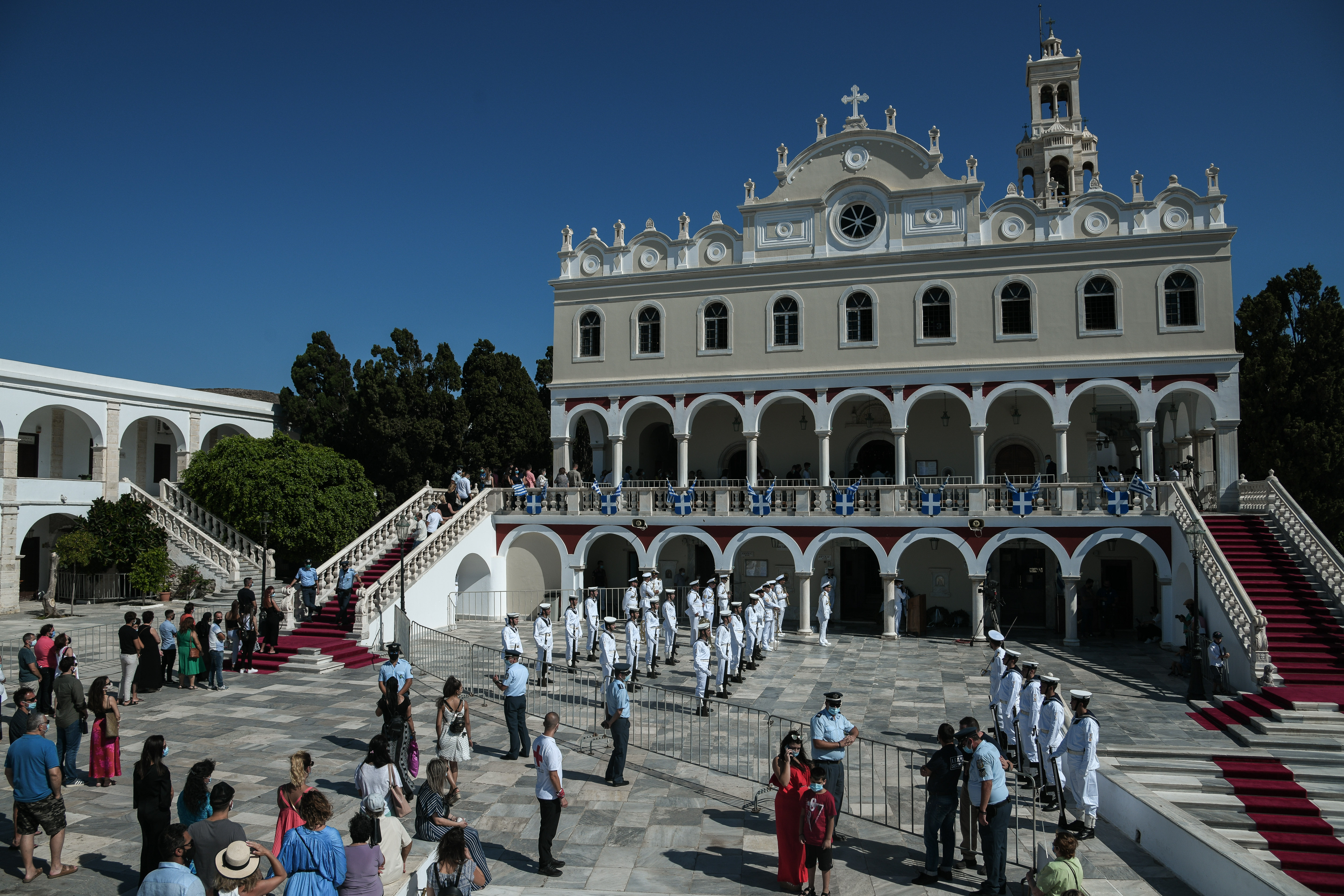 Αγήματα του πολεμικού ναυτικού αποδίδουν τιμές στην Παναγία, σε ένα ξεχωριστό εορτασμό, εν μέσω πανδημίας.
