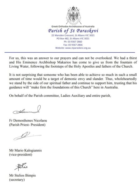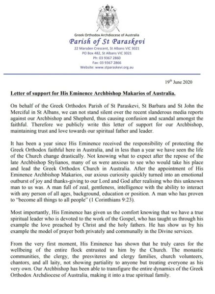 Επιστολή συμπαράστασης στον Σεβασμιώτατο Αρχιεπίσκοπο Μακάριο της Αυστραλίας, που κατηγορήθηκε για αγορά ακινήτου στο Σίδνεϊ, όπου εδρεύει, έστειλαν οι ενορίες Αγίας Παρασκευής, Αγίας Βαρβάρας και Αγίου Ιωάννου του Ελεήμονος από την περιοχή St Albans της Βικτώρια. Στην επιστολή αναφέρεται πως πριν από ένα χρόνο, όταν και εκοιμήθη ο προηγούμενος Αρχιεπίσκοπος, Στυλιανός, οι πιστοί αδημονούσαν να μάθουν ποιος θα πάρει τη θέση του. Υπήρχε ένα συναίσθημα περιέργειας, αλλά και αγωνίας για την επόμενη μέρα της Ορθόδοξης Εκκλησίας στην Αυστραλία. Ας μην ξεχνάμε ότι η Μελβούρνη θεωρείται μετά την Αθήνα η δεύτερη πολυπληθέστερη ελληνική πόλη στον κόσμο.