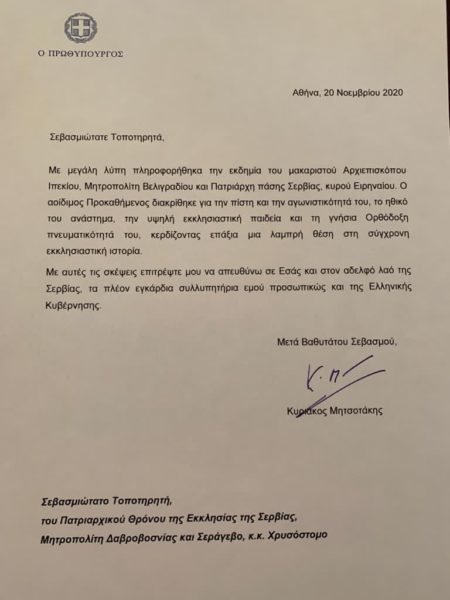 Η επιστολή Μητσοτάκη για την εκδημία του Πατριάρχη Σερβίας