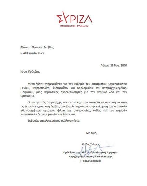 Ο Αρχηγός της Αξιωματικής Αντιπολίτευσης κ. Αλέξης Τσίπρας, για την εκδημία του μακαριστού Πατριάρχου Σερβίας κυρού Ειρηναίου μεταξύ άλλων, αναφέρει, ότι είχε την ευκαιρία να συναντήσει κατά το παρελθόν τον μακαριστό Πατριάρχη, ο οποίος συνέβαλλε σημαντικά στην ενίσχυση των ιστορικών ελληνοσερβικών σχέσεων και των πνευματικών δεσμών μεταξύ των δύο λαών.
