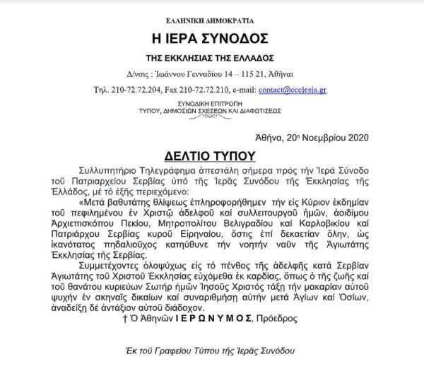 Συλλυπητήριο Τηλεγράφημα απεστάλη προς την Ιερά Σύνοδο του Πατριαρχείου Σερβίας υπό της Ιεράς Συνόδου της Εκκλησίας της Ελλάδος, επί τη εκδημία του μακαριστού Πατριάρχου Σερβίας κυρού Ειρηναίου.