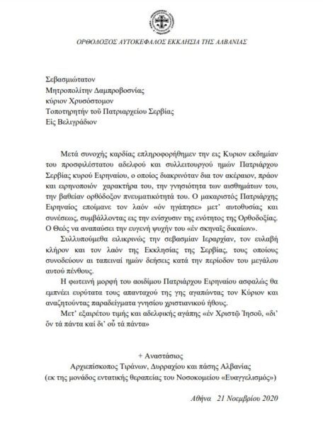 Ο Μακαριώτατος Αρχιεπίσκοπος Αλβανίας κ.κ. Αναστάσιος προς τον Τοποτηρητή του Πατριαρχείου Σερβίας στο Βελιγράδι, προκειμένου να εκφράσει τη θλίψη του για την εκδημία του μακαριστού Πατριάρχου Σερβίας κυρού Ειρηναίου αναφέρει, μεταξύ άλλων σε μήνυμα που έστειλε ότι η φωτεινή μορφή του αοιδίμου Πατριάρχου Ειρηναίου ασφαλώς θα εμπνέει πάντοτε και πάντες όσους αναζητούν παραδείγματα γνησίου χριστιανικού ήθους.
