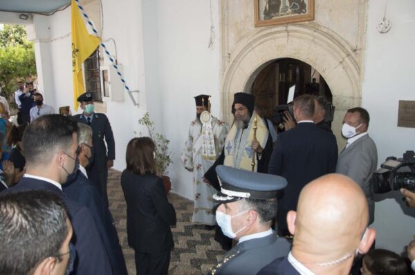Μετά την απόλυση ο Σεβασμιώτατος υπεδέχθη στα προπύλαια του Μητροπολιτικού Ι. Ναού την Πρόεδρο της Δημοκρατίας και αφού την καλοσώρισε προσωπικώς με χαρά ως ο οικείος Ποιμενάρχης του νησιωτικού σχηματισμού της Μεγίστης, της μετέφερε τις Πατρικές και Πατριαρχικές ευχές και το «ευ παρέστητε» της Α.Θ.Π. του Οικουμενικού μας Πατριάρχου κ.κ. Βαρθολομαίου, καθ’ ότι και η Ιερά μας Μητρόπολη αποτελεί αναπόσπαστο τμήμα και μία εκ των λοιπών εν Δωδεκανήσω Επαρχιών του Οικουμενικού Πατριαρχείου .