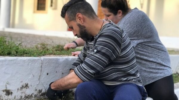 Η εικόνα του νεαρού ζευγαριού μαγνητίζει τα βλέμματα των λιγοστών περαστικών του νησιού. Σκυμμένοι και οι δύο με ευλάβεια στο ψηφιδωτό δάπεδο του αύλιου χώρου του ιερού ναού Αγίων Κωνσταντίνου και Ελένης στο Καστελόριζο, καθαρίζουν ένα-ένα με περισσή υπομονή τα βότσαλα από τα αγριόχορτα.