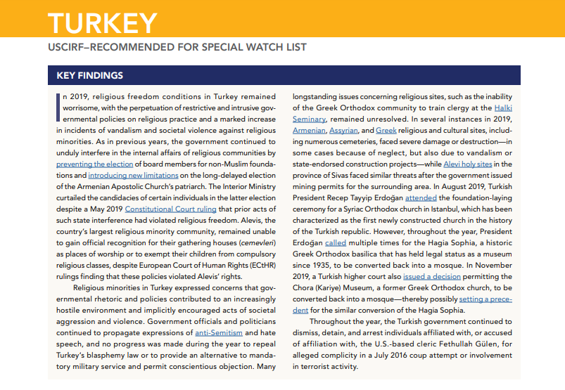 Η USCIRF επισημαίνει επίσης ότι καθόλη τη διάρκεια του έτους, ο Τούρκος πρόεδρος Ρετζέπ Ταγίπ Ερντογάν έκανε λόγος για μετατροπή της Αγίας Σοφίας τζαμί, “μιας ιστορικής Ελληνικής Ορθόδοξης εκκλησίας που έχει νομικό καθεστώς ως μουσείο από το 1935”