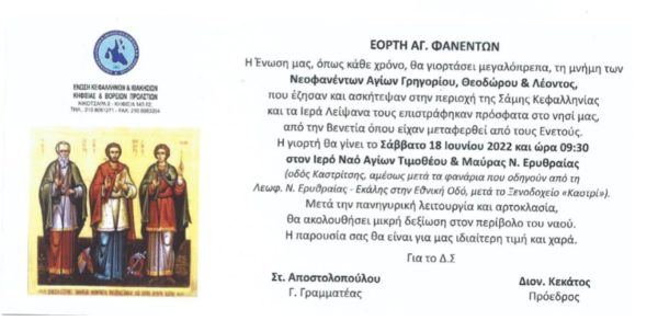 Οι Κεφαλλήνες Κηφισίας και Β. Προαστίων γιορτάζουν τους Αγ. Φανέντες
