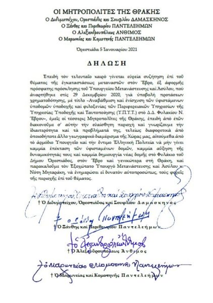 Μάλιστα, αγωνιώντας για το μέλλον μιας ιδιαίτερα ευαίσθητης περιοχής, κοντά στα σύνορα με την Τουρκία, αναφέρουν χαρακτηριστικά: «Εμείς οι τέσσερις Μητροπολίτες της Θράκης, επειδή από ετών διακονούμε σ’ αυτήν την ευαίσθητη περιοχή και γνωρίζουμε την ιδιαιτερότητα και τα προβλήματά της, τελείως διαφορετικά από οποιοδήποτε άλλο γεωγραφικό διαμέρισμα της χώρας μας, αιτούμεθα από το αρμόδιο υπουργείο και την έντιμο ελληνική Πολιτεία να μη γίνει καμία επέκταση των υφιστάμενων δομών, καμία αύξηση της δυναμικότητάς τους και καμία δημιουργία νέας δομής στο Φυλάκιο του Δήμου Ορεστιάδος, στον Έβρο και γενικότερα στη Θράκη. Παρακαλούμε τον εξοχώτατο υπουργό Μετανάστευσης και Ασύλου κ. Νότη Μηταράκη, να ενημερώσει ει δυνατόν αυτοπροσώπως, τους φορείς της περιοχής επί του θέματος».
