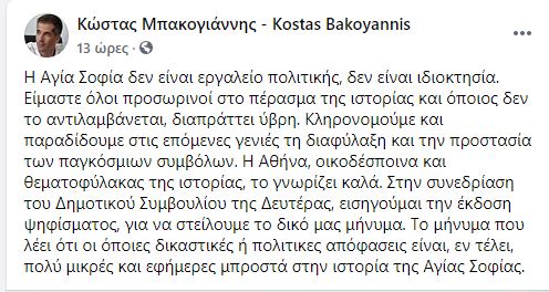 Για την μετατροπή της Αγίας Σοφίας σε τζαμί έκανε ανάρτηση στην προσωπική του σελίδα στο Facebook ο δήμαρχος Αθηνών κ. Κώστας Μπακογιάννης όπου τόνισε χαρακτηριστικά ότι “Είμαστε όλοι προσωρινοί στο πέρασμα της ιστορίας” ενώ στη συνέχει σημείωσε “οι όποιες δικαστικές ή πολιτικές αποφάσεις είναι, εν τέλει, πολύ μικρές και εφήμερες μπροστά στην ιστορία της Αγίας Σοφίας”.