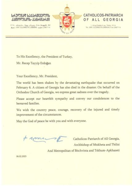 “Ταρακουνήθηκε ο κόσμος από τον καταστροφικό σεισμό της 6ης Φεβρουαρίου. Ένας πολίτης της Γεωργίας σκοτώθηκε από τη θεομηνία. Εκ μέρους της Γεωργιανής Ορθόδοξης Εκκλησίας και εμού, εκφράζω τη βαθιά μου θλίψη για την τραγωδία. Παρακαλώ δεχτείτε την εγκάρδια συμπάθειά μας και τα συλλυπητήρια για τις οικογένειες των εκλιπόντων. Εύχομαι στη χώρα ειρήνη, κουράγιο, ανάρρωση των τραυματιών και έγκαιρη αποκατάσταση των ζημιών”, αναφέρει.