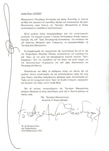 Ο Πάπας και Πατριάρχης Αλεξανδρείας και πάσης Αφρικής κ.κ. Θεόδωρος Β’, όπως αναφέρει σχετικό ανακοινωθέν του Πατριαρχείου Αλεξανδρείας και Πάσης Αφρικής, “πληροφορηθείς τις άκρως καταστροφικές συνέπειες του ισχυρού σεισμού που έπληξε σήμερα, 6η Φεβρουαρίου 2023 περιοχές της νοτιοανατολικής Τουρκίας και της Συρίας, στερώντας την ζωή σε δεκάδες συνανθρώπων μας, απέστειλε Πατριαρχικά Γράμματα προς την ΑΘΠ τον Οικουμενικό Πατριάρχη κ.κ. Βαρθολομαίο και την ΑΘΜ τον Πατριάρχη Αντιοχείας κ.κ. Ιωάννη, εκφράζοντας τις συλλυπητήριες ευχές και την συμπαράστασή Του για το δυσάρεστο αυτό γεγονός”.