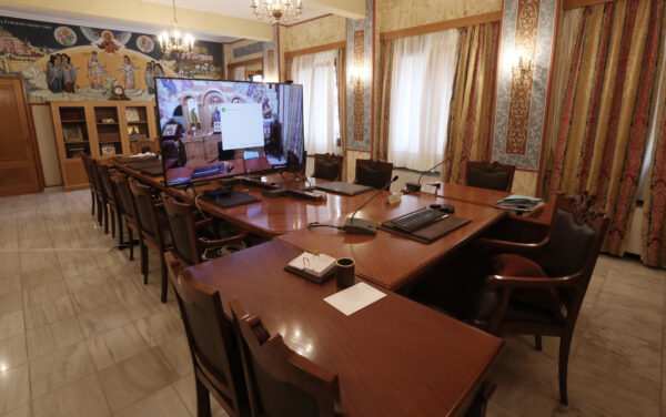 Όλα είναι έτοιμα στο Συνοδικό Μέγαρο για την έναρξη της τηλεδιάσκεψης της τακτικής συνεδρίασης της Διαρκούς Ιεράς Συνόδου της Εκκλησίας της Ελλάδος για το μήνα Απρίλιο.