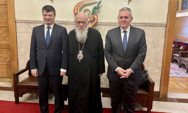 Η ηγεσία της ΔΣΟ είχε, επίσης, συνάντηση με τον Αρχιεπίσκοπο Αθηνών και πάσης Ελλάδος κ.κ. Ιερώνυμο, στον οποίο και εξέφρασε την ευγνωμοσύνη της για την εμπιστοσύνη με την οποία περιβάλλει η Εκκλησία της Ελλάδος τις πρωτοβουλίες του διακοινοβουλευτικού θεσμού, ιδίως σε κρίσιμες περιόδους, όπου οι Χριστιανοί της Μέσης Ανατολής απειλούνται με αφανισμό και σπουδαία μνημεία της οικουμενικής Ορθοδοξίας, όπως η Αγία Σοφία της Πόλης και χριστιανικά μνημεία των Αρμενίων στο ΝαγκόρνοΚαραμπάχ βρίσκονται σε κατάσταση κινδύνου.