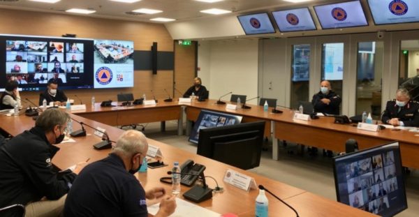 Ολοκληρώθηκε η ευρεία σύσκεψη υπό τον Υπουργό Προστασίας του Πολίτη, Μιχάλη Χρυσοχοΐδη, παρουσία του Υφυπουργού Πολιτικής Προστασίας και Διαχείρισης Κρίσεων, Νίκου Χαρδαλιά και με συμμετοχή του Γενικού Γραμματέα Υποδομών, Γιώργου Καραγιάννη στο Κέντρο Επιχειρήσεων της Πολιτικής Προστασίας (κτίριο Φάρος).