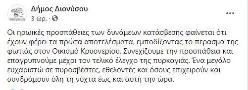 “Οι ηρωικές προσπάθειες των δυνάμεων κατάσβεσης φαίνεται ότι έχουν φέρει τα πρώτα αποτελέσματα, εμποδίζοντας το περασμα της φωτιάς στον Οικισμό Κρυονερίου. Συνεχίζουμε την προσπάθεια και επαγρυπνούμε μέχρι τον τελικό έλεγχο της πυρκαγιάς. Ένα μεγάλο ευχαριστώ σε πυροσβέστες, εθελοντές και όσους επιχειρούν και συνδράμουν όλη τη νύχτα έως και αυτή την ώρα” αναφέρει η ανακοίνωση του Δήμου Διονύσου.
