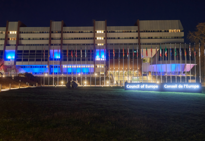 Η κεντρική πρόσοψη του Συμβουλίου της Ευρώπης στο Στρασβούργο φωταγωγήθηκε με ελληνικά χρώματα για την φετινή ιστορική επέτειο.