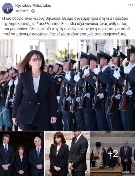 «Η αισιοδοξία είναι γένους θηλυκού. Θερμά συγχαρητήρια στη νέα Πρόεδρο της Δημοκρατίας, κ. Σακελλαροπούλου. Μία άξια γυναίκα, ένας άνθρωπος που μας ενώνει όλους σε μία στιγμή που έχουμε ανάγκη περισσότερο παρά ποτέ να μείνουμε ενωμένοι. Της εύχομαι κάθε επιτυχία στα καθήκοντά της».