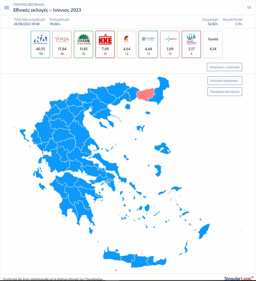 Τα αποτελέσματα των βουλευτικών εκλογών με ενσωμάτωση του 99,6% της Επικράτειας.