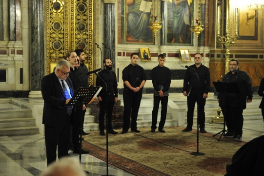 β) της Βυζαντινής Χορωδίας του Συνδέσμου Ιεροψαλτών Περιφέρειας Αττικής Ρωμανός ο Μελωδός και Ιωάννης ο Δαμασκηνός, υπό την διεύθυνση του Προέδρου κ. Ηλία Ρεδιάδη-Τούμπα,