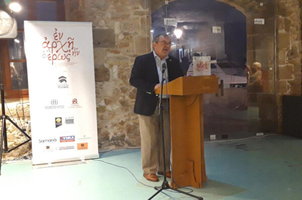 Στον Χαιρετισμό του, ο κ. Κωνσταντίνος Ζορμπάς, καλωσόρισε τους παρευρισκομένους και ευχαρίστησε τους συνδιοργανωτές, τονίζοντας την πολυσήμαντη διάσταση του έρωτα σε όλες τις εκφάνσεις της ζωής. Κατά τον Δρα Ζορμπά, «Οι άνθρωποι της Τέχνης δεν εκφράζουν μόνο μέσα από το έργο τους τα συναισθήματα και τις προσωπικές τους ανησυχίες. Αποτελούν και μία φωνή διαμαρτυρίας για τις τυχόν αγκυλώσεις της κοινωνίας που οφείλουμε να θεραπεύσουμε μέσα από την Παιδεία, τον Πολιτισμό και τον λόγο». Παράλληλα, όπως υπογράμμισε χαρακτηριστικά: «Στην Κρήτη των παραδόσεων και της αυστηρότητας ο Ερωτόκριτος δημιούργησε νέες ρωγμές για να εισέλθουν τα πιο όμορφα και ειλικρινή συναισθήματα της ανθρώπινης ύπαρξης. Φύση επαναστατική και ανατρεπτική παραβιάζει όλους τους κανόνες της εποχής. Αναμφισβήτητα, η εμπειρία μας που πηγάζει από την ενασχόληση με τον Ερωτόκριτο, φανερώνει πως είναι ένα έργο πολυδιάστατο και πανανθρώπινο με πολλές αναγνώσεις».