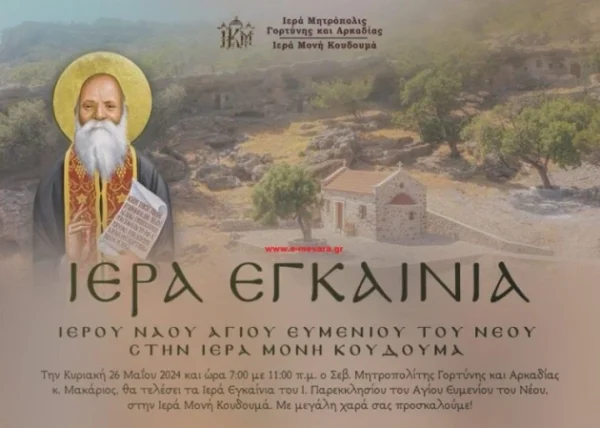 Η Κρήτη ευλαβείται τον Όσιο Ευμένιο και προς τιμήν του έχουν ξεκινήσει να ανεγείρονται ιερά παρεκκλήσια. Ένα από αυτά θα εγκαινιαστεί στην Ιερά Μονή Κουδουμά, στις 26 Μαΐου, από τον Σεβ. Μητροπολίτη Γορτύνης και Αρκαδίας κ. Μακάριο.
