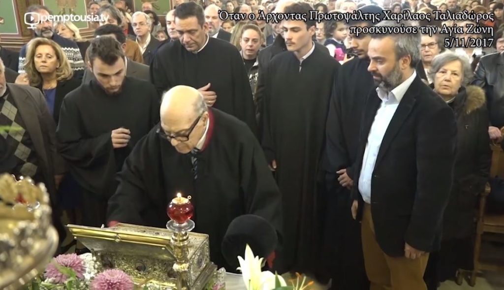 Ο Άρχοντας της Ψαλτικής, Χαρίλαος Ταλιαδώρος, κατεβαίνει από το ψαλτήρι και ψάλλει μπροστά από την Αγία Ζώνη της Υπεραγίας Θεοτόκου το Άξιον Εστίν σε ήχο πλ. α’. και εν συνεχεία σκύβει ευλαβικά και προσκυνά το ιερό κειμήλιο της Παναγίας μας.