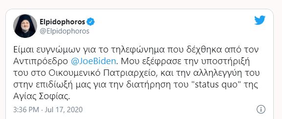 Στο τουίτ, ο Αρχιεπίσκοπος κ. Ελπιδοφόρος ανέφερε: «Είμαι ευγνώμων για το τηλεφώνημα που δέχθηκα από τον Αντιπρόεδρο @JoeBiden. Μου εξέφρασε την υποστήριξή του στο Οικουμενικό Πατριαρχείο, και την αλληλεγγύη του στην επιδίωξή μας για την διατήρηση του “status quo” της Αγίας Σοφίας».