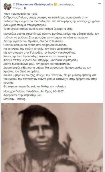 Ήταν πρωτομαγιά του 1957. Ο όσιος Παΐσιος εκάρη μοναχός και έστειλε μια φωτογραφία στην πολυαγαπημένη μητέρα του Ευλαμπία, στο πίσω μέρος της οποίας είχε γράψει ένα λυρικό ποίημα αποχαιρετισμού.