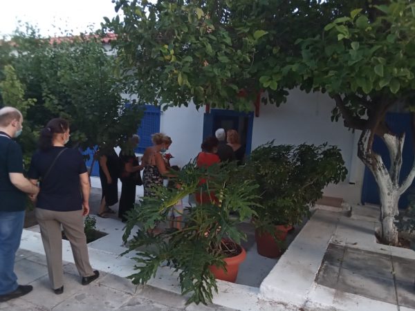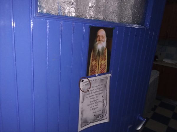 Στο βάθος του προαυλίου ευρίσκεται το Ιερό κελί του Μακαριστόυ π. Ευμενίου Σαριδάκη όπου μετά το πέρας του Εσπερινού οι ευλαβείς πιστοί σχημάτισαν ουρά για να εισέλθουν και να προσκυνήσουν.