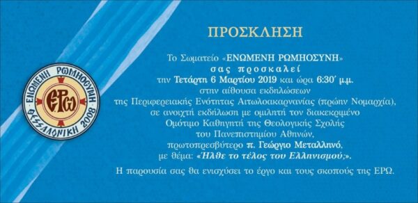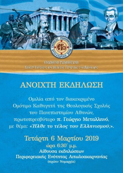 Η ΕΝΩΜΕΝΗ ΡΩΜΙΟΣΥΝΗ διοργανώνει ανοιχτή εκδήλωση με ομιλία εκ του Ομοτίμου Καθηγητού της Θεολογικής Σχολής Αθηνών, Πρωτοπρεσβυτέρου π. Γεωργίου Μεταλληνού, υπό το θέμα “Ήλθε το τέλος του Ελληνισμού;”, η οποία θα πραγματοποιηθεί κατά την Τετάρτη 6 Μαρτίου 2019 και ώρα 6.30 μ.μ. στην αίθουσα εκδηλώσεων της Περιφερειακής Ενότητας Αιτωλοακαρνανίας (πρώην Νομαρχία).
