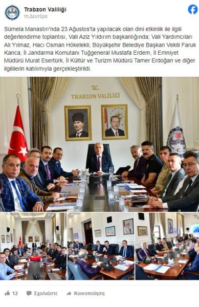 Για τη φετινή επιστροφή στην Παναγία Σουμελά, έστω και στις 23 Αυγούστου, τη Δευτέρα ο κυβερνήτης Τραπεζούντας συγκάλεσε σύσκεψη στην οποία συμμετείχαν αντιδήμαρχος του Μητροπολιτικού Δήμου Τραπεζούντας, ο αρχηγός της Επαρχιακής Αστυνομίας, ο επαρχιακός διευθυντής Τουρισμού και ο επαρχιακός διευθυντής Υγείας.