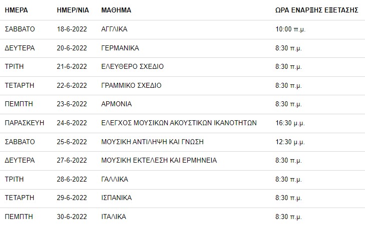 για το μουσικό μάθημα «Μουσική Αντίληψη και Γνώση», η εξέταση στο αντικείμενο της Μουσικής Αντίληψης έχει διάρκεια 30’ λεπτών, ενώ η εξέταση στο αντικείμενο της Μουσικής Γνώσης έχει διάρκεια 2 ωρών.