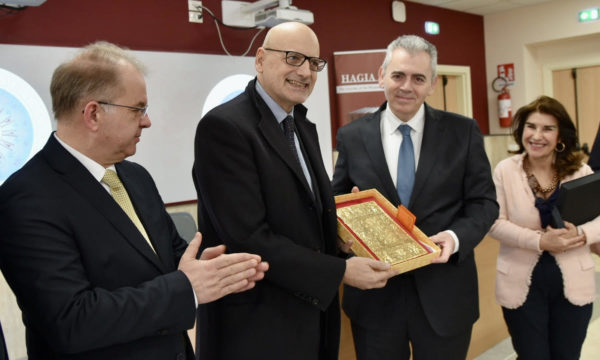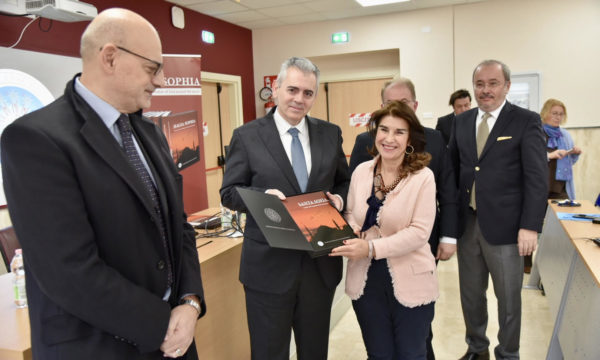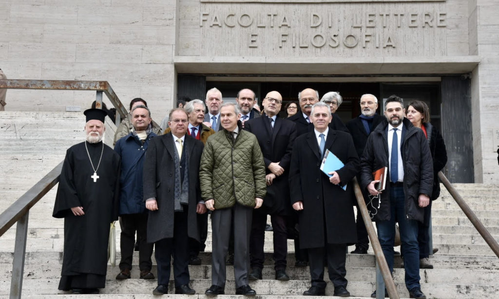 Ο επικεφαλής της ΔΣΟ εξέφρασε τη χαρά για την παρουσία τους «στην αιώνια πόλη, στη Ρώμη, με συναδέλφους βουλευτές από την Ιορδανία, τη Βουλγαρία, την Αλβανία και την Ελλάδα, εδώ στη γενέτειρα του ρωμαϊκού πολιτισμού και δικαίου, που μαζί με την αρχαία ελληνική γραμματεία και την χριστιανική παράδοση συνέθεσαν τα θεμέλια του μωσαϊκού της σύγχρονης Ευρώπης. Χαιρόμαστε, γιατί μας δίνετε την δυνατότητα στο μεγαλύτερο πανεπιστήμιο της Ευρώπης La Sapienza (η Σοφία), να σας παρουσιάσουμε ένα έργο που αφορά La Sapienza del Dio, την Σοφία του Θεού. Άλλωστε, σπεύδω να υποθέσω ότι ο Πάπας Βονιφάτιος το 1303 στην Σοφία του κόσμου, ως προϊόν της Σοφίας του Θεού θέλησε να αναφέρεται το δημιούργημα του, το πανεπιστήμιό σας».