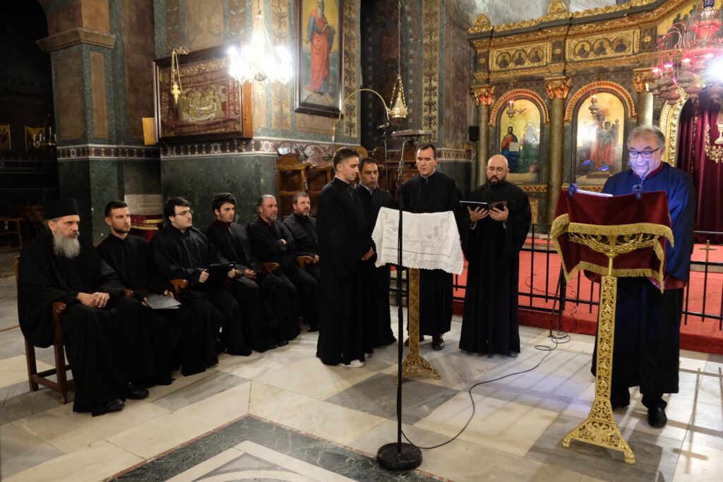 Ακολούθως, αντιπροσωπευτικά μέλη του Πέτρου Εφεσίου έψαλλαν οι: Αθανάσιος Βουγιουκλής, Άρχων Υμνωδός της Αγίας του Χριστού Μεγάλης Εκκλησίας, Γέρων Ιάκωβος, πρωτοψάλτης του Πανσέπτου ναού του Πρωτάτου.