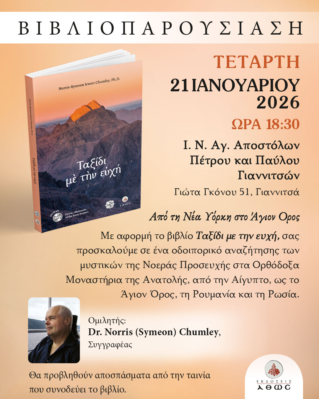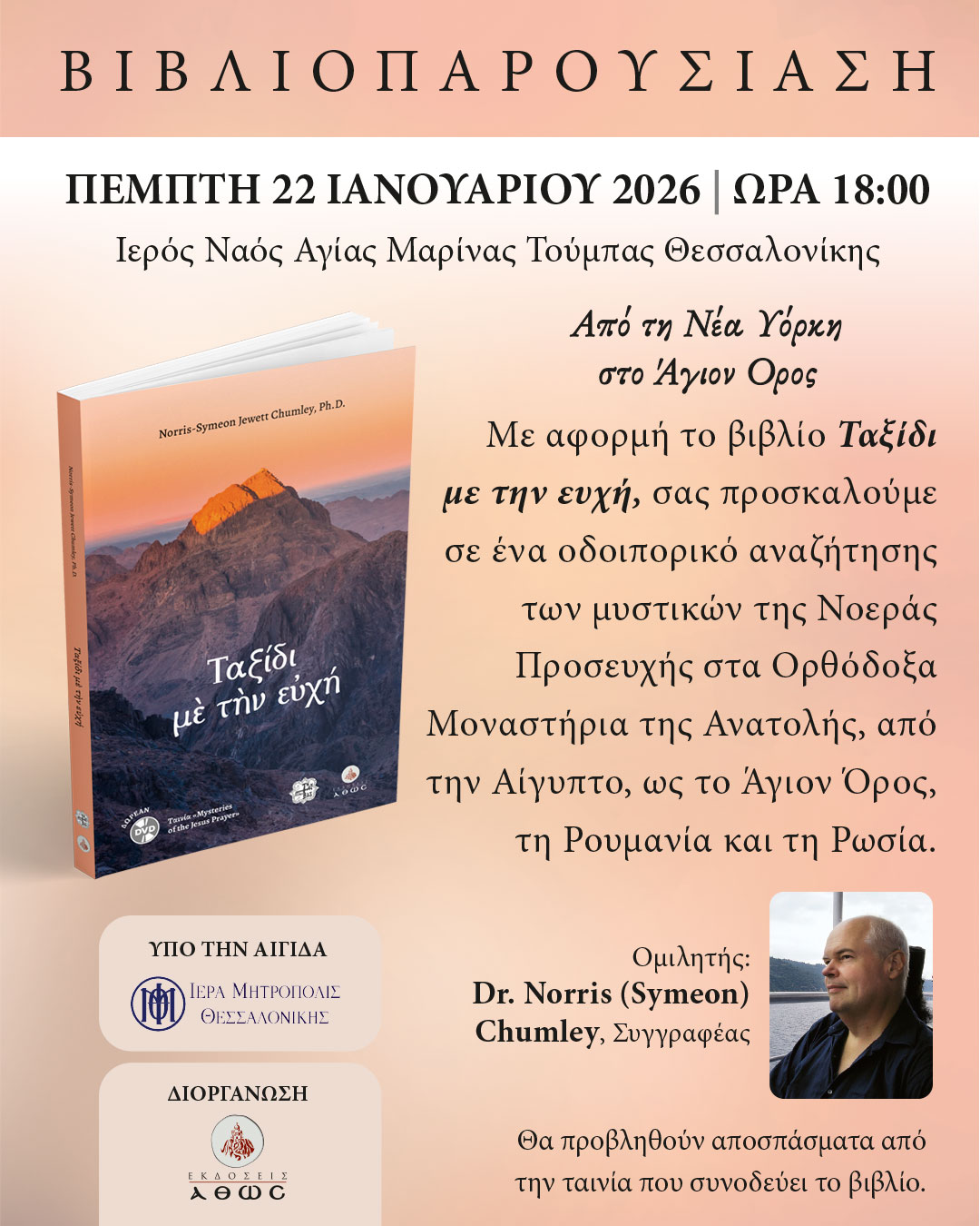 Με μεγάλη χαρά οι Εκδόσεις Άθως ανακοινώνουν την παρουσίαση του βιβλίου Ταξίδι με την ευχή από τον ίδιο τον συγγραφέα του, Dr. Norris (Symeon) Jewett Chumley σε δύο μοναδικές εκδηλώσεις στα Γιαννιτσά και την Θεσσαλονίκη.
