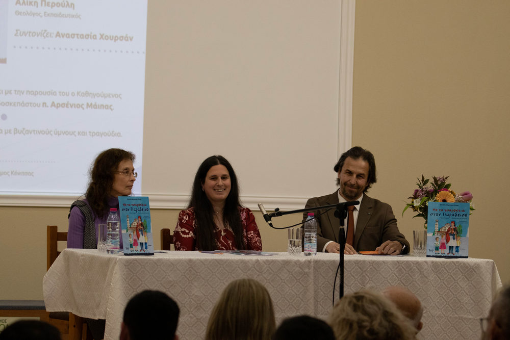 Επόμενη ομιλήτρια η κα. Αλίκη Περούλη, Θεολόγος – Εκπαιδευτικός, η οποία εμπνεόμενη από έκδοση του βίου του Αγίου Γεωργίουγια μικρούς αναγνώστες, μίλησε για τον παιδικό συναξαριστή και την πολύτιμη αξία του στο γαλουχισμό των παιδιών, ο οποίος ξεκινάει πρώτα και κύρια από την οικογένεια.